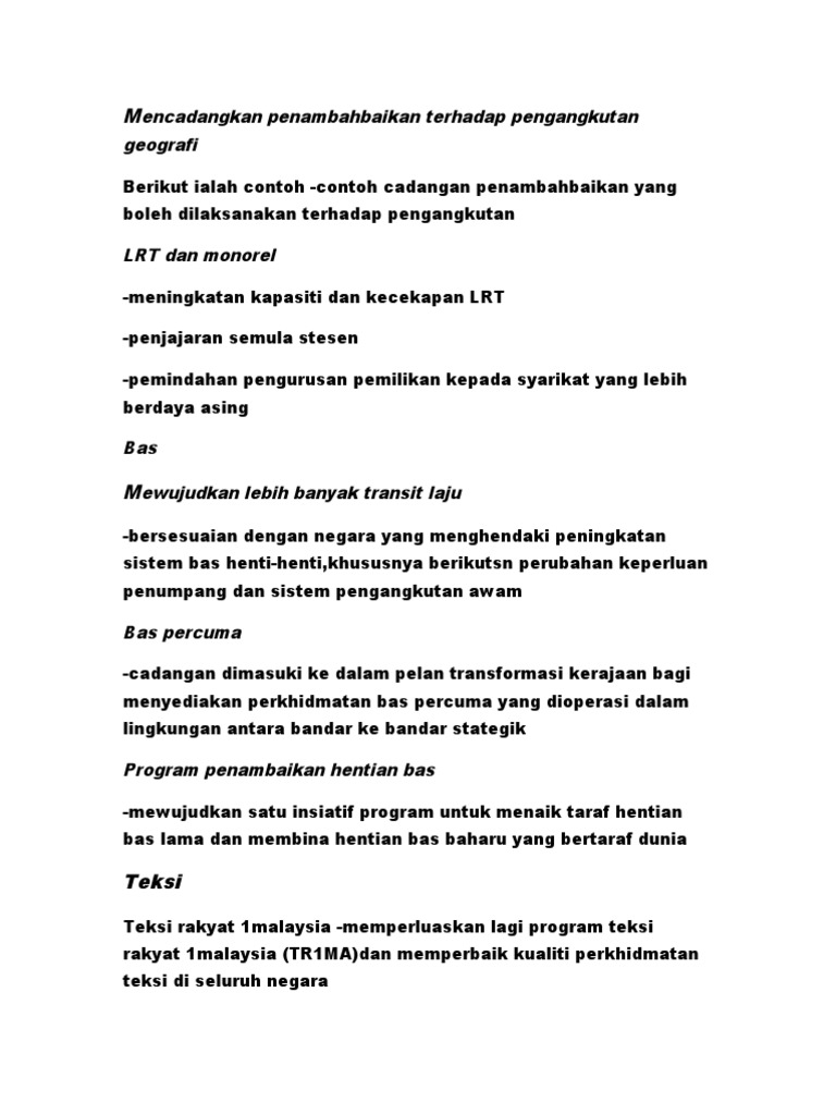 Cadangan Penambahbaikan Pengangkutan Malaysia Di Malaysia Pada Masa Studocu
